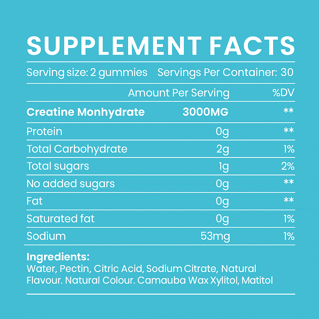 2 gominolas aportan 3 g de creatina monohidrato pura, lo que las convierte en una excelente opción para quienes buscan complementar su alimentación de forma sencilla y agradable, ya que contienen la ingesta media diaria recomendada.